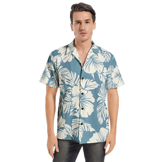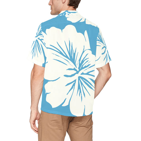 White and Blue Hibiscus Men's Hawaiian Shirt Hawaiian Shirt with Chest Pocket