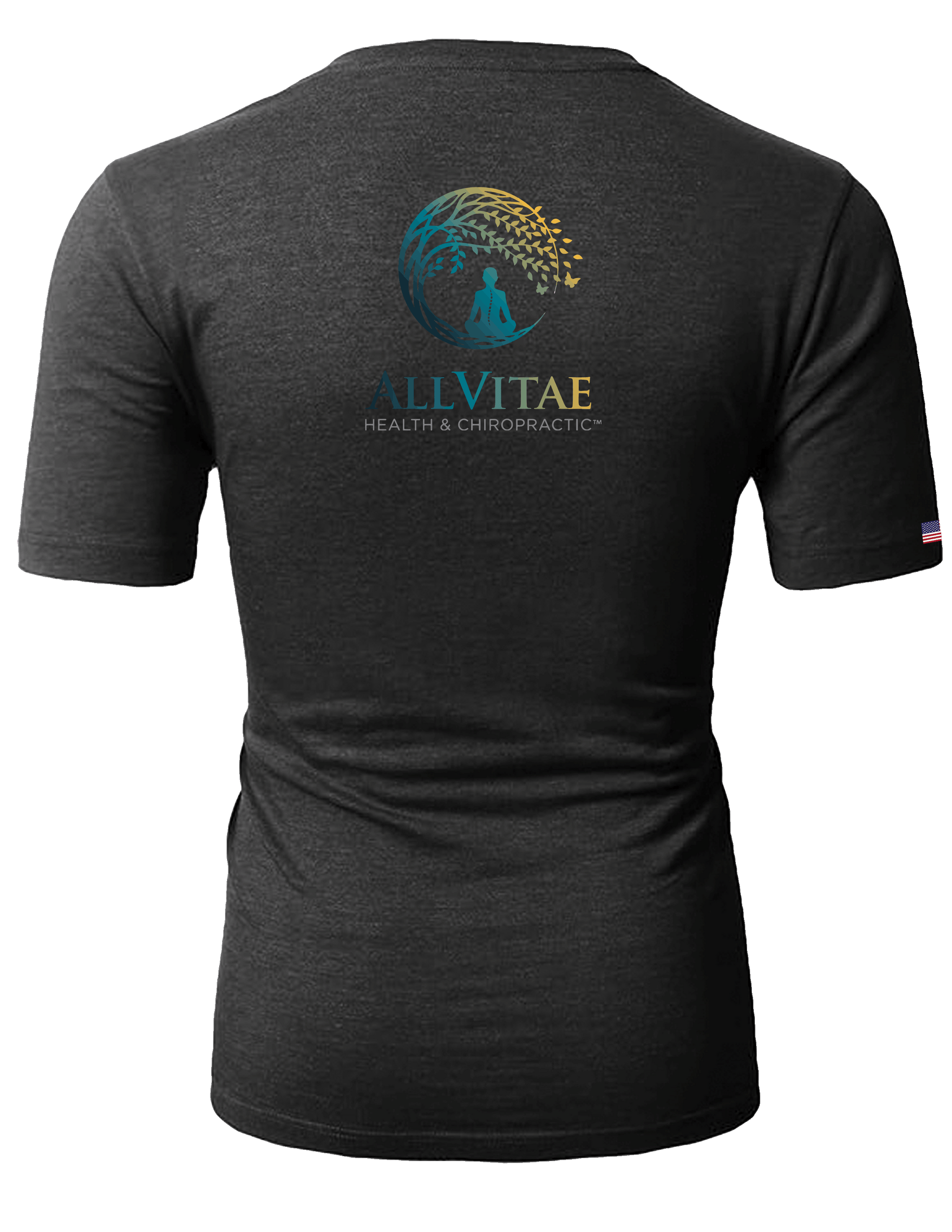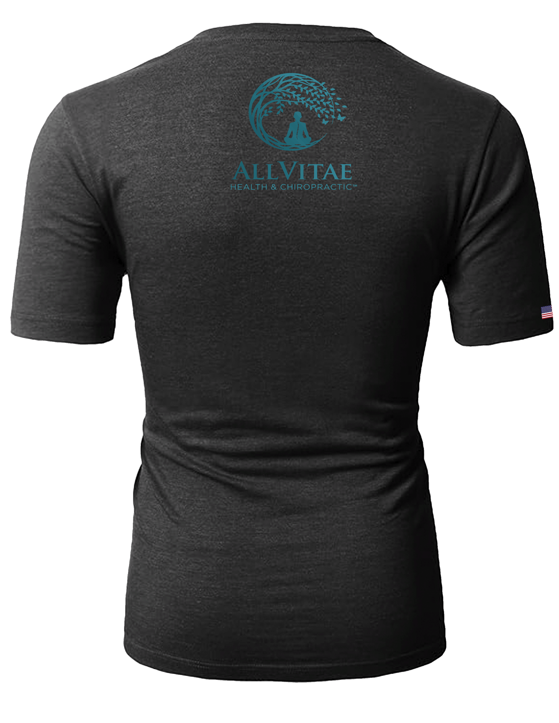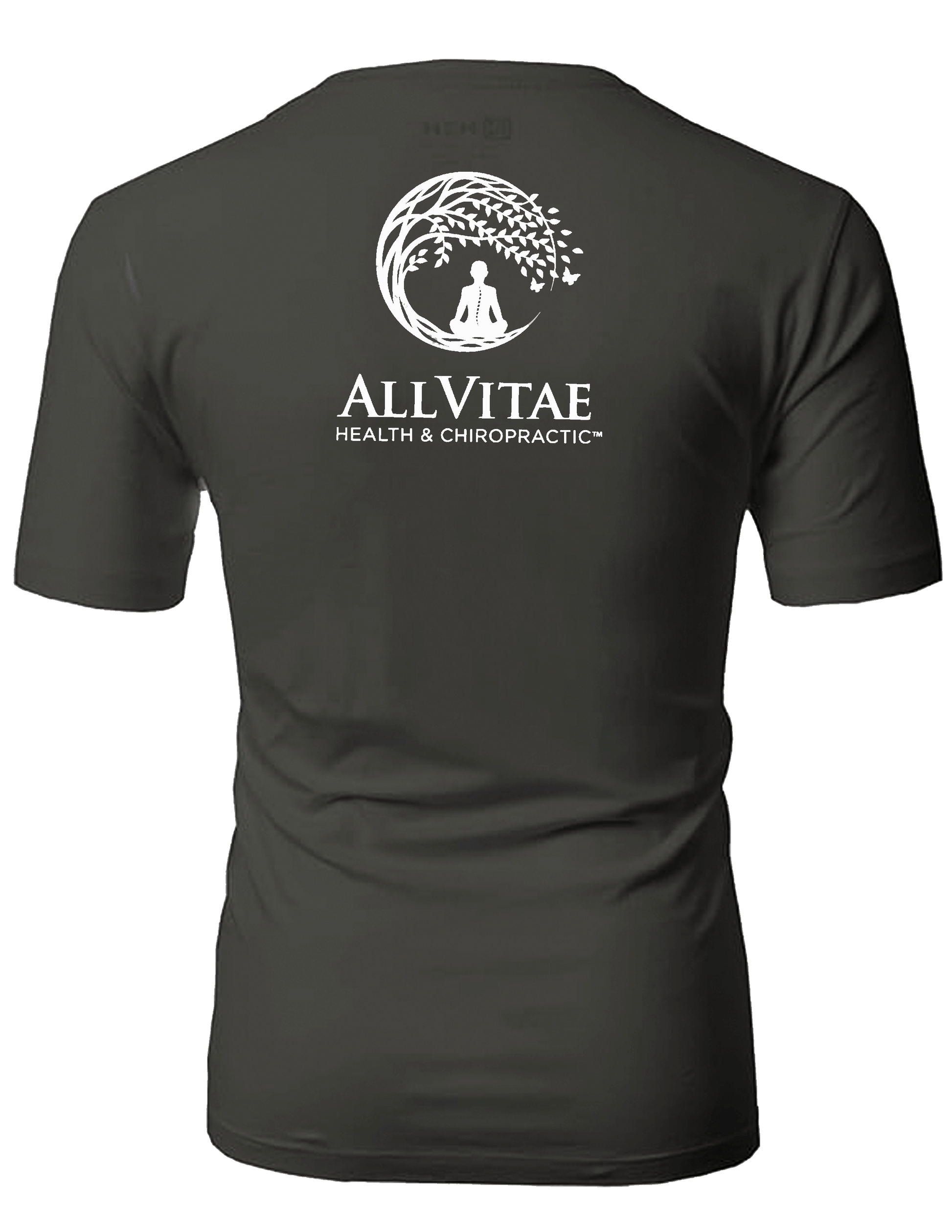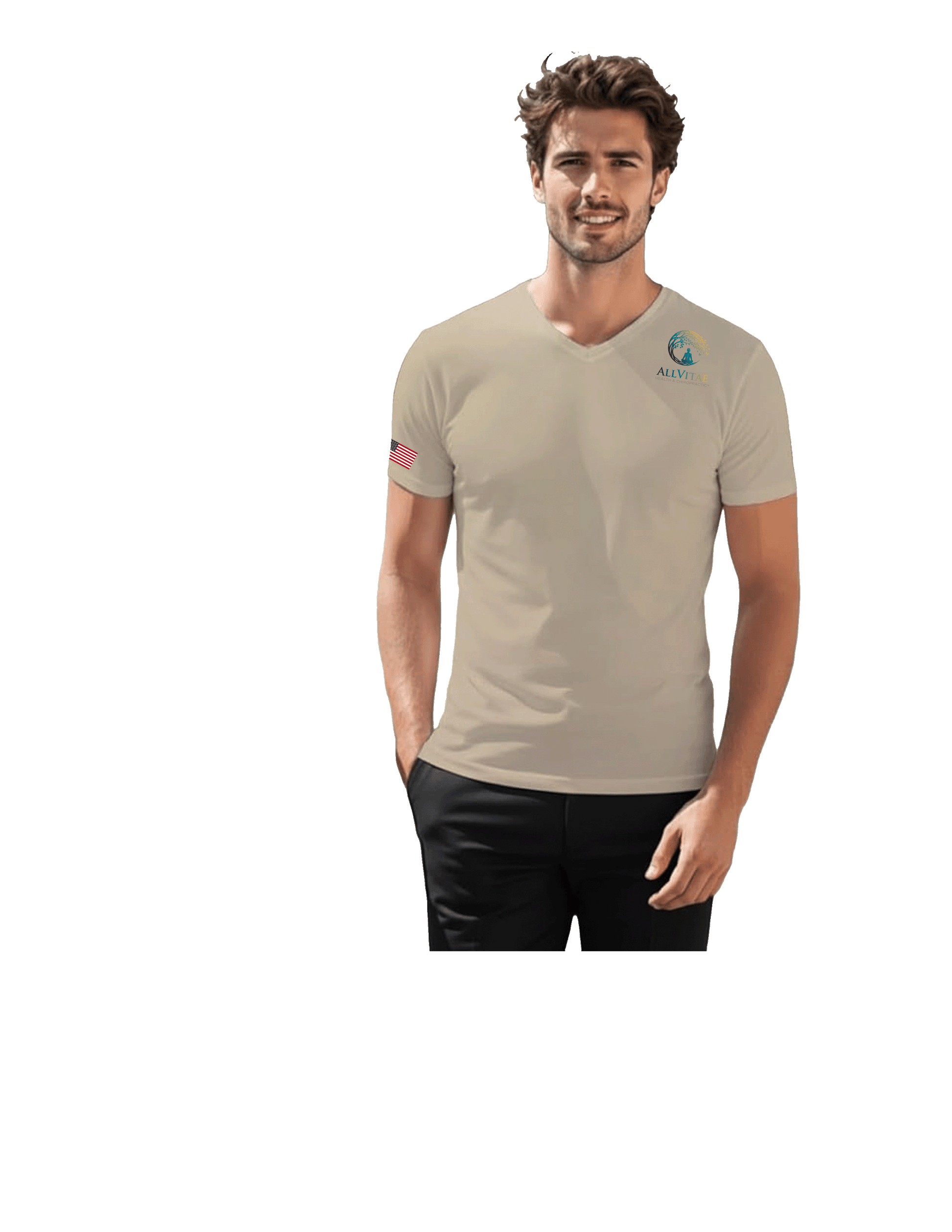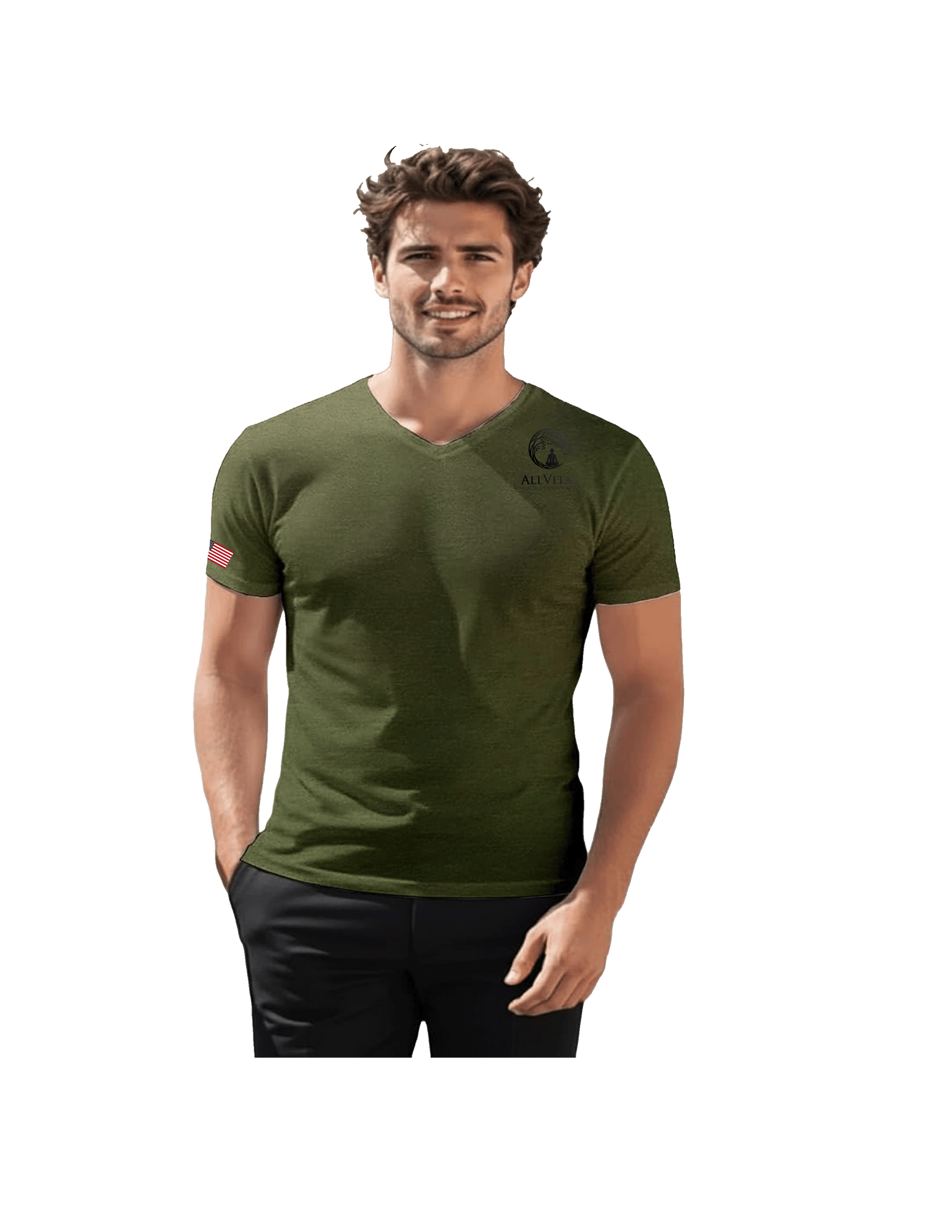ALLVITAE logo on H2H Men's Muscle Vneck featuring Military Green, Black, Charcoal, and Sand color shirts with the Allvitae logo options and American flag on right sleeve. Small logo on left front and large logo on back.