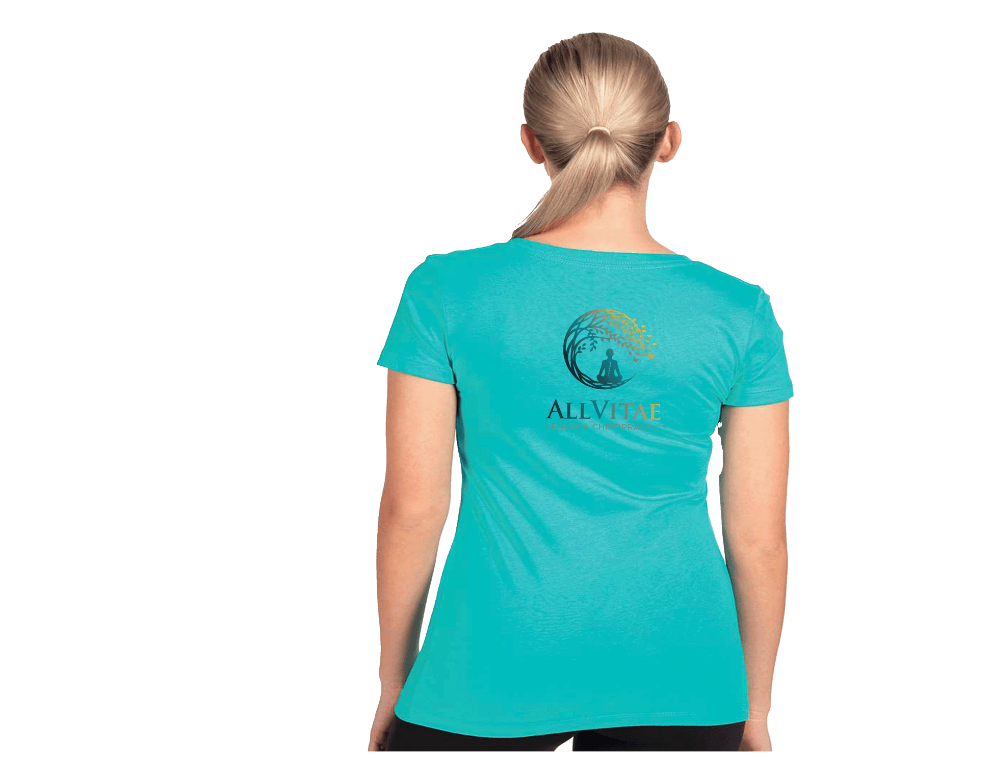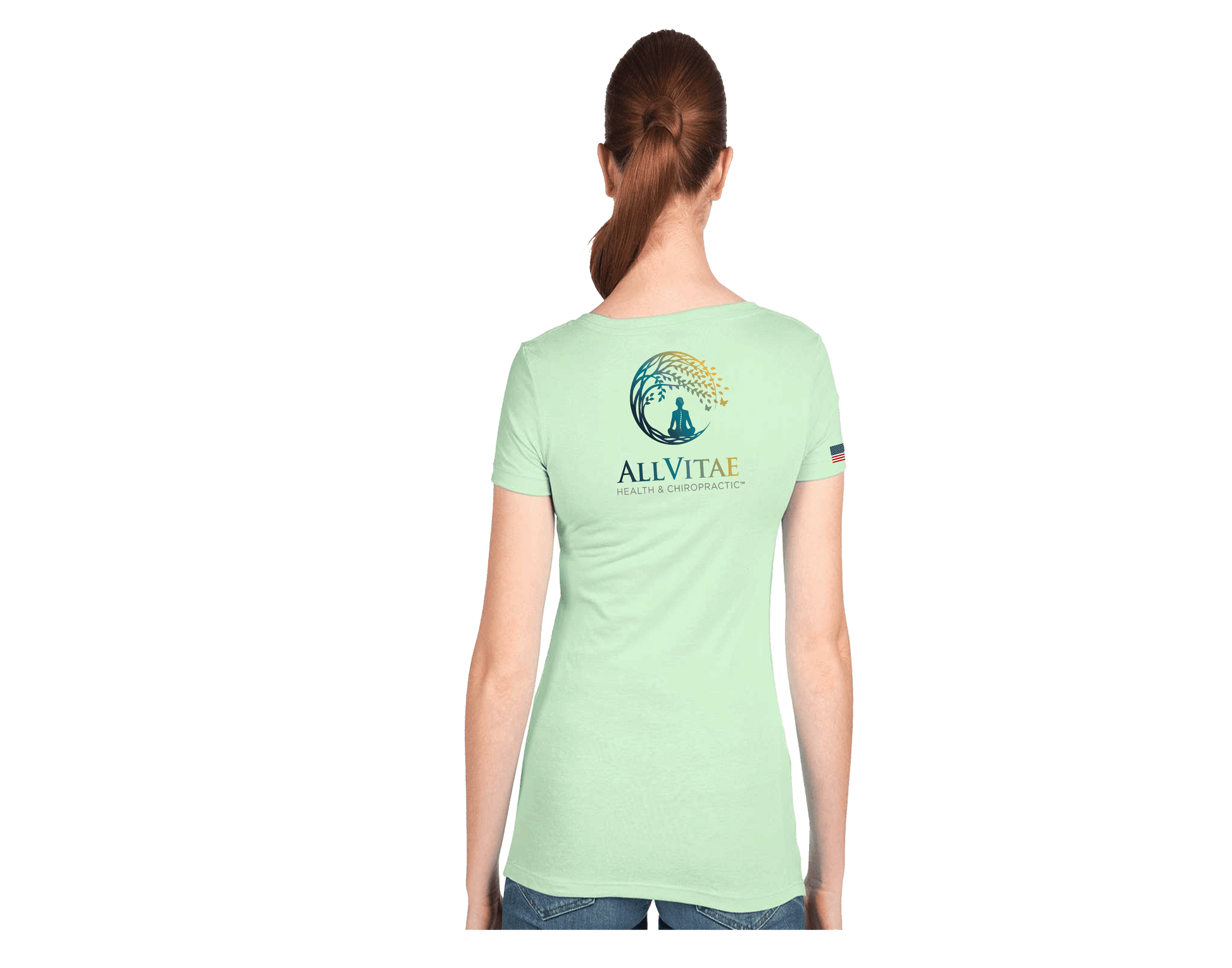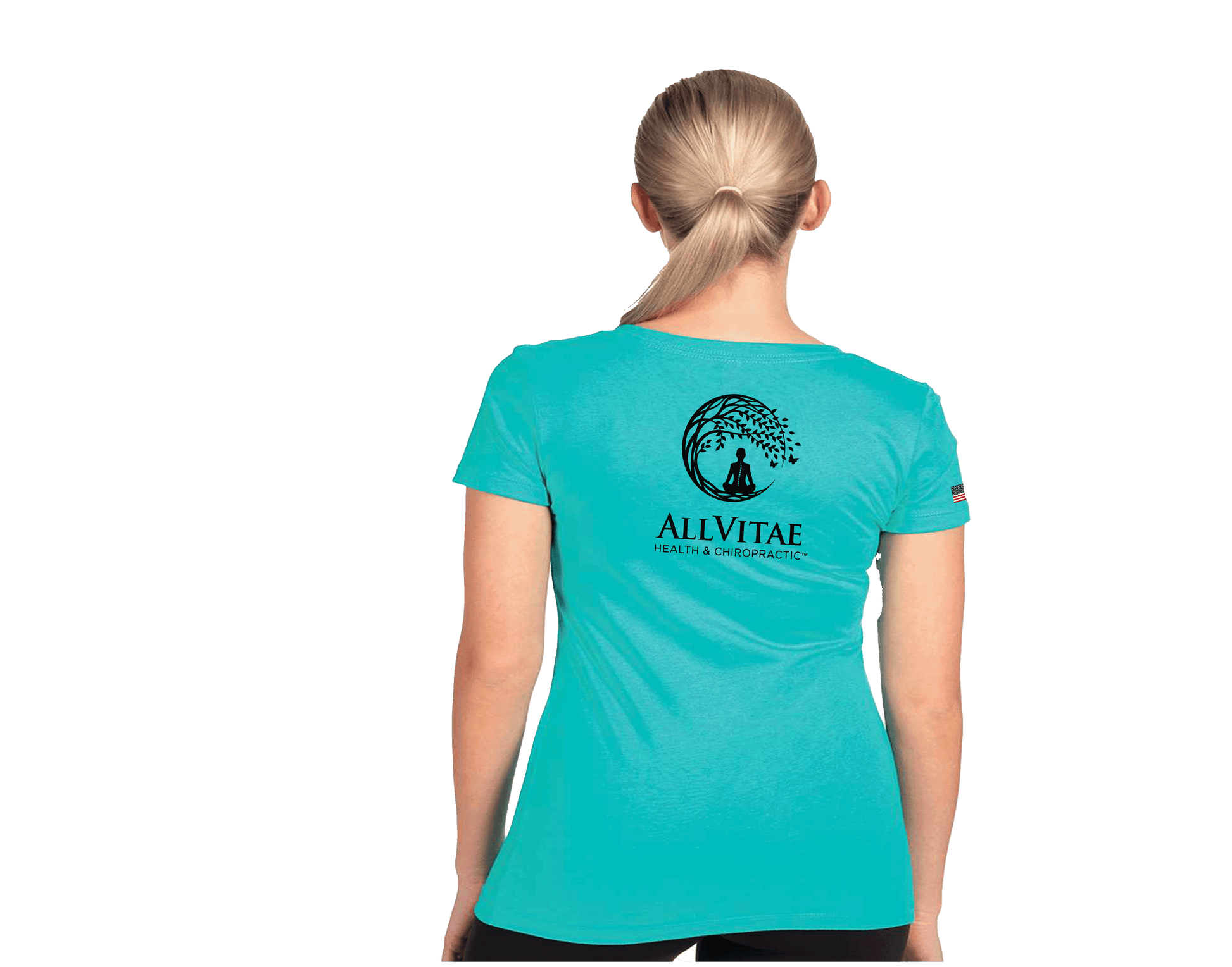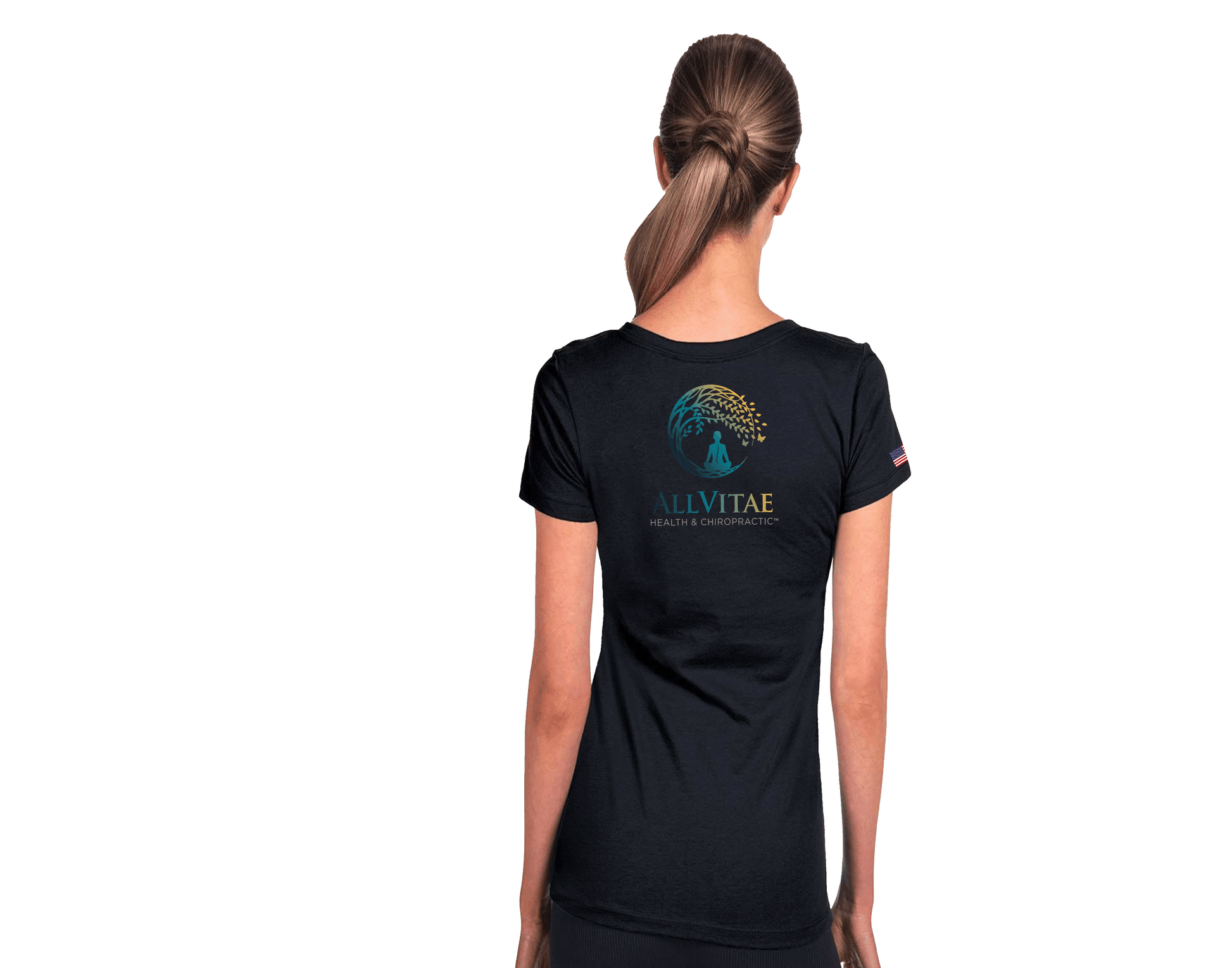 Allvitae Logo can be printed in original color, black or original color with a light grey stroke. Logos on front left and larger logo on back. USA flag added to right sleeve