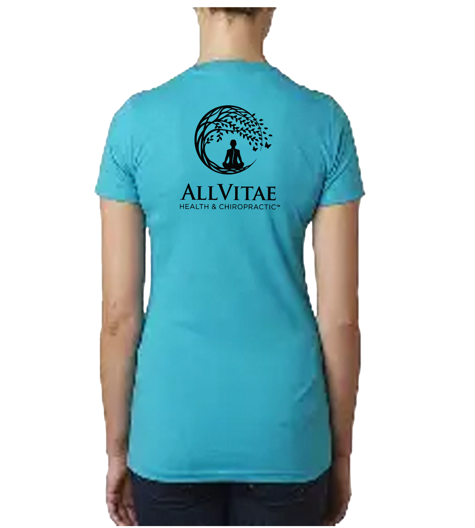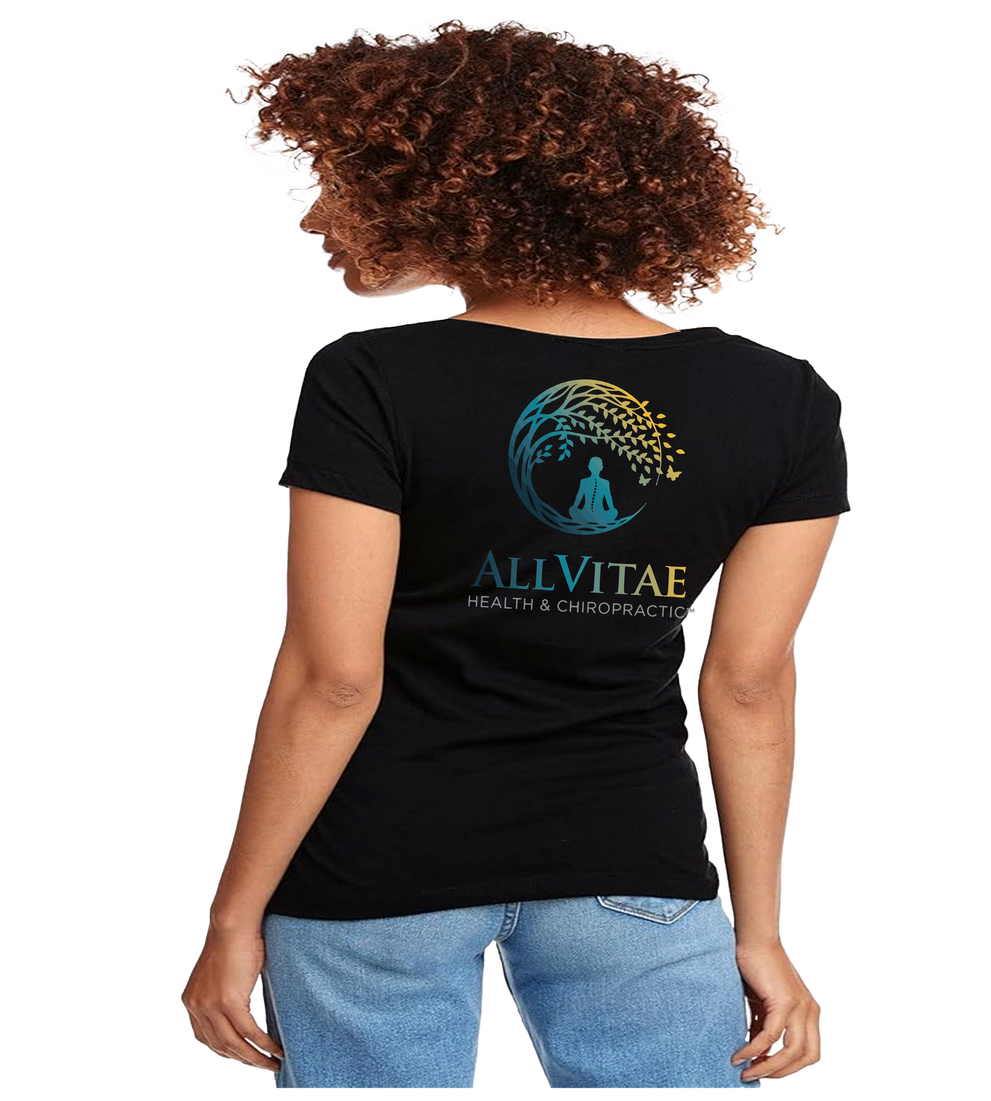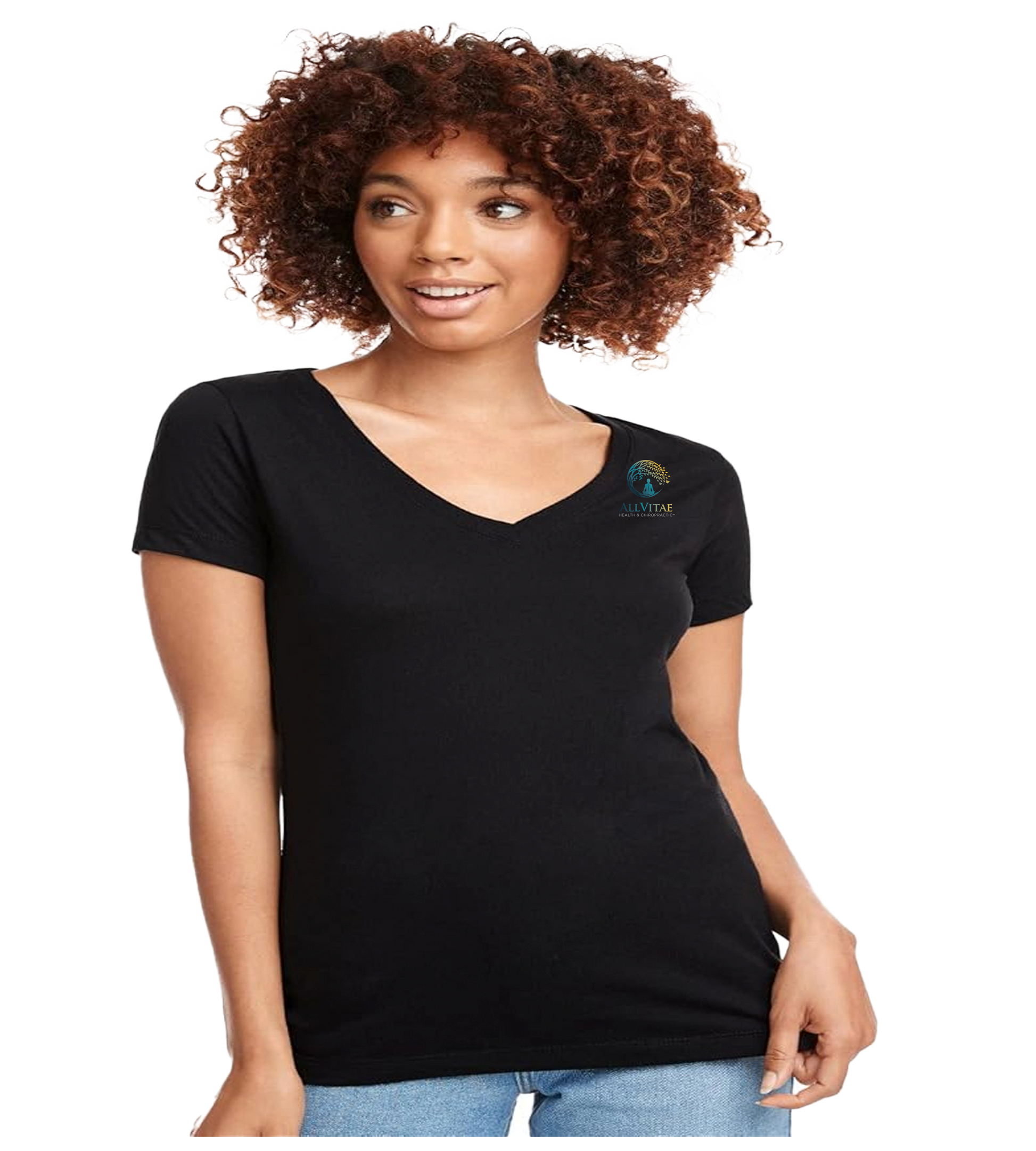 Allvitae V Neck Next Level 6640 with logo on front left and large logo on back. Color of logo- black on lighter colored shirts and original color of logo on darker colored shirts..